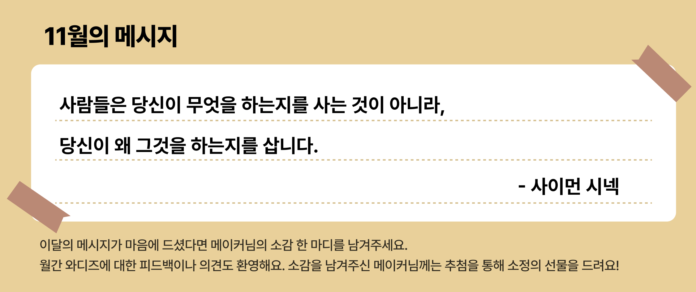 이번 달 월간와디즈는 메이커님의 프로젝트가 가지고 있는 이야기를 효과적으로 스토리텔링할 수 있도록 다양한 콘텐츠를 준비했어요. 뿐만 아니라 많은 분들이 프로젝트 초기 단계에서 궁금해하셨던 매출 부스팅 전략에 대한 전문가의 시크릿 팁도 담았으니, 지금 바로 꼼꼼히 확인해 보세요!